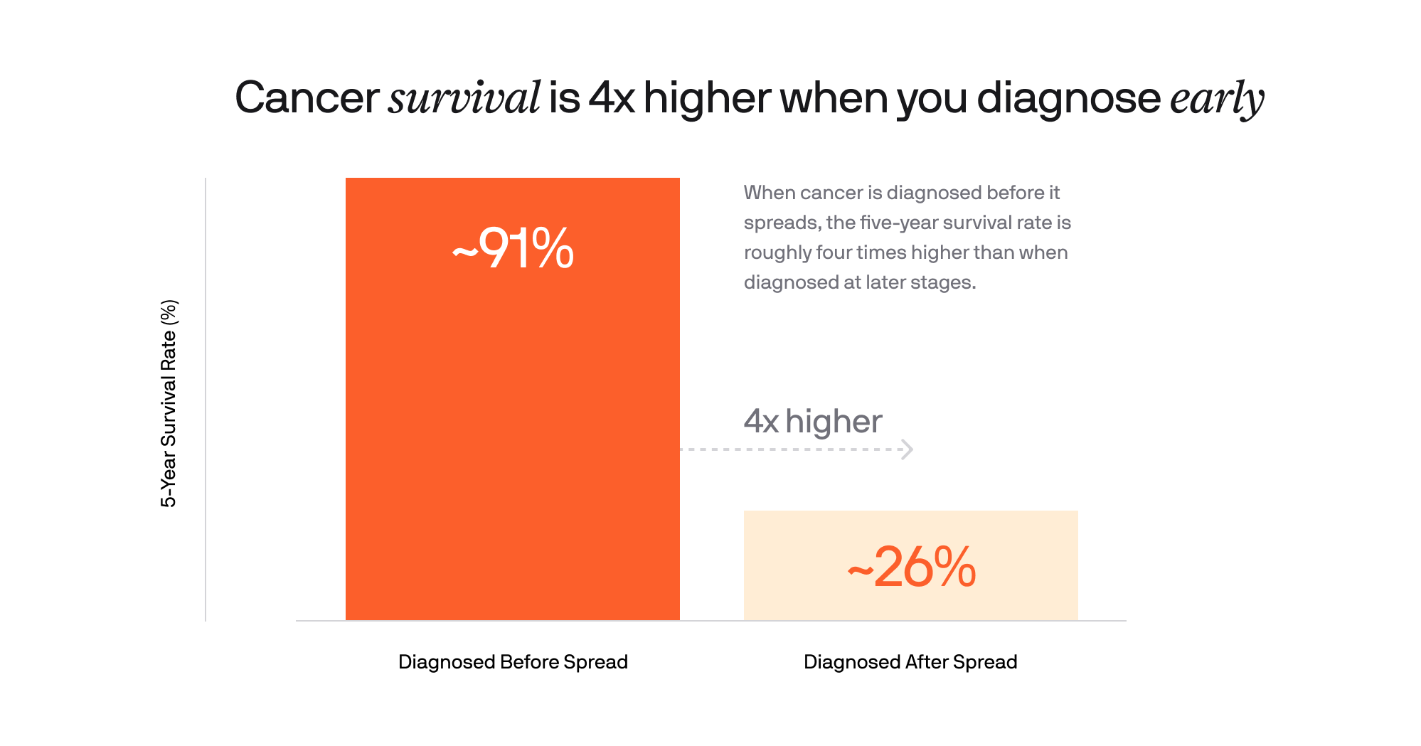 There is one statistic that matters more than almost any other: When cancer is diagnosed before it spreads, the five-year survival rate is roughly four times higher than when diagnosed at later stages.6