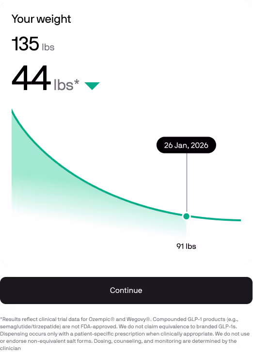 *Weight loss data reflect data from the STEP 1 clinical trial for FDA-approved semaglutide 2.4mg (Wilding et al., NEJM 2021). Compounded GLP-1 products (e.g., semaglutide/tirzepatide) are not FDA-approved. We do not claim equivalence to branded GLP-1s. Dispensing occurs only with a patient-specific prescription when clinically appropriate. We do not use or endorse non-equivalent salt forms. Dosing, counseling, and monitoring are determined by the clinician. Individual results may vary.